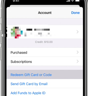 - Next, tap the button for “Redeem Gift Card or Code.”