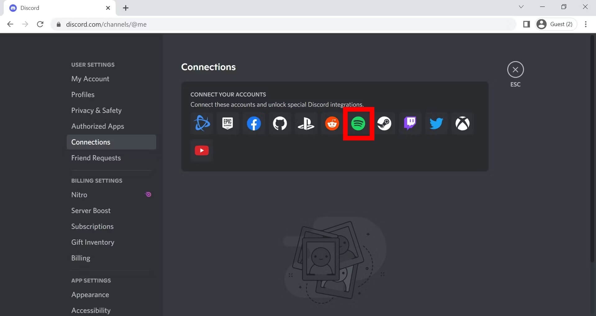 - You'll find a "Connections" tab under "User Settings." Click on it, The Connections menu houses all the accounts you have that are currently connected to your Discord account. Then select the Spotify logo under the "Connect Your Accounts" section.